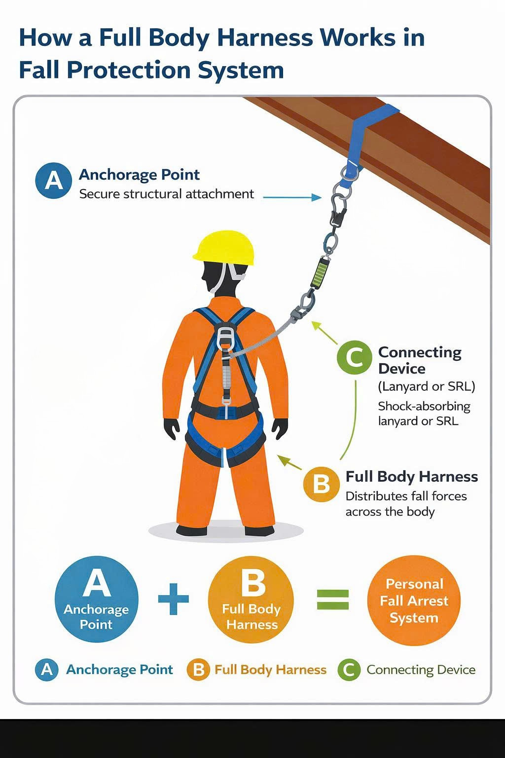 Trong một hệ thống chống rơi ngã hoàn chỉnh, full body harness (dây đai an toàn toàn thân) đóng vai trò then chốt. Dây đai kết nối người lao động với điểm neo thông qua dây giảm sốc hoặc bộ chống rơi tự rút (SRL). Khi xảy ra sự cố rơi ngã, dây đai giúp hấp thụ và phân tán lực tác động, đồng thời giữ cơ thể người lao động ở tư thế thẳng đứng, từ đó giảm thiểu chấn thương và ngăn ngừa các tổn hại nghiêm trọng hơn.