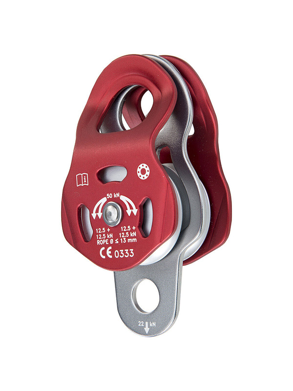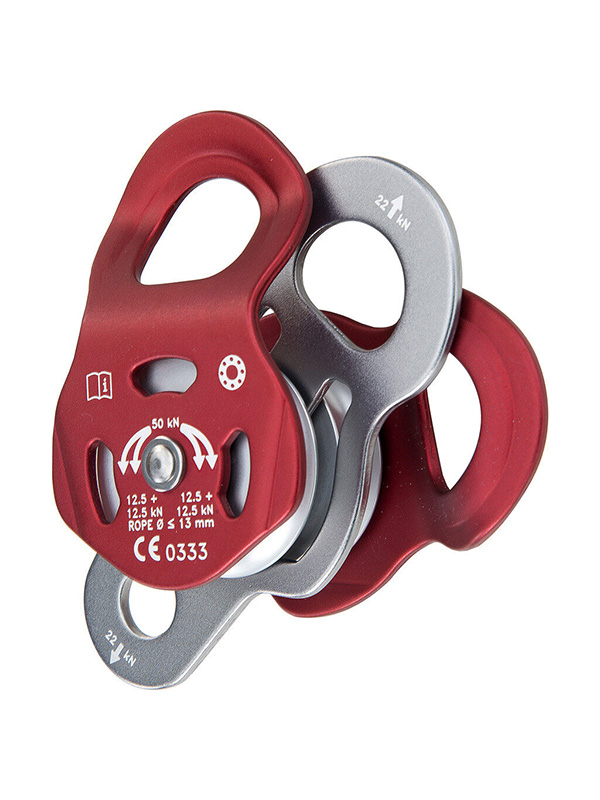 Double pulley with mobile side plates. Up to three connectors can be hooked in the large eyelet plus one connector in the smaller eyelet.