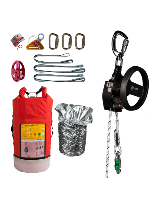 Bộ sản phẩm bao gồm: Dây cứu hộ, 2 dây neo 1,2 m, 1 dây neo 0,8 m, bảo vệ cạnh kèm móc thép twist-lock, puly 22 kN, thiết bị kẹp dây cứu hộ, 2 móc thép twist-lock, bộ kiểm tra, và túi đạt chứng nhận cho nâng hạ