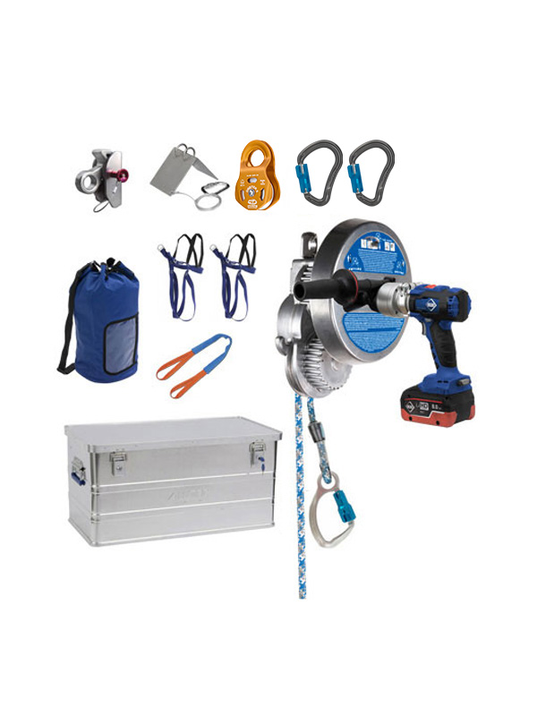 Thiết bị nâng cứu hộ hạ dây (abseil rescue lifting device) với khả năng nâng đến 200 m, sử dụng máy vặn vít dùng pin kèm 2 pin 8.0Ah.